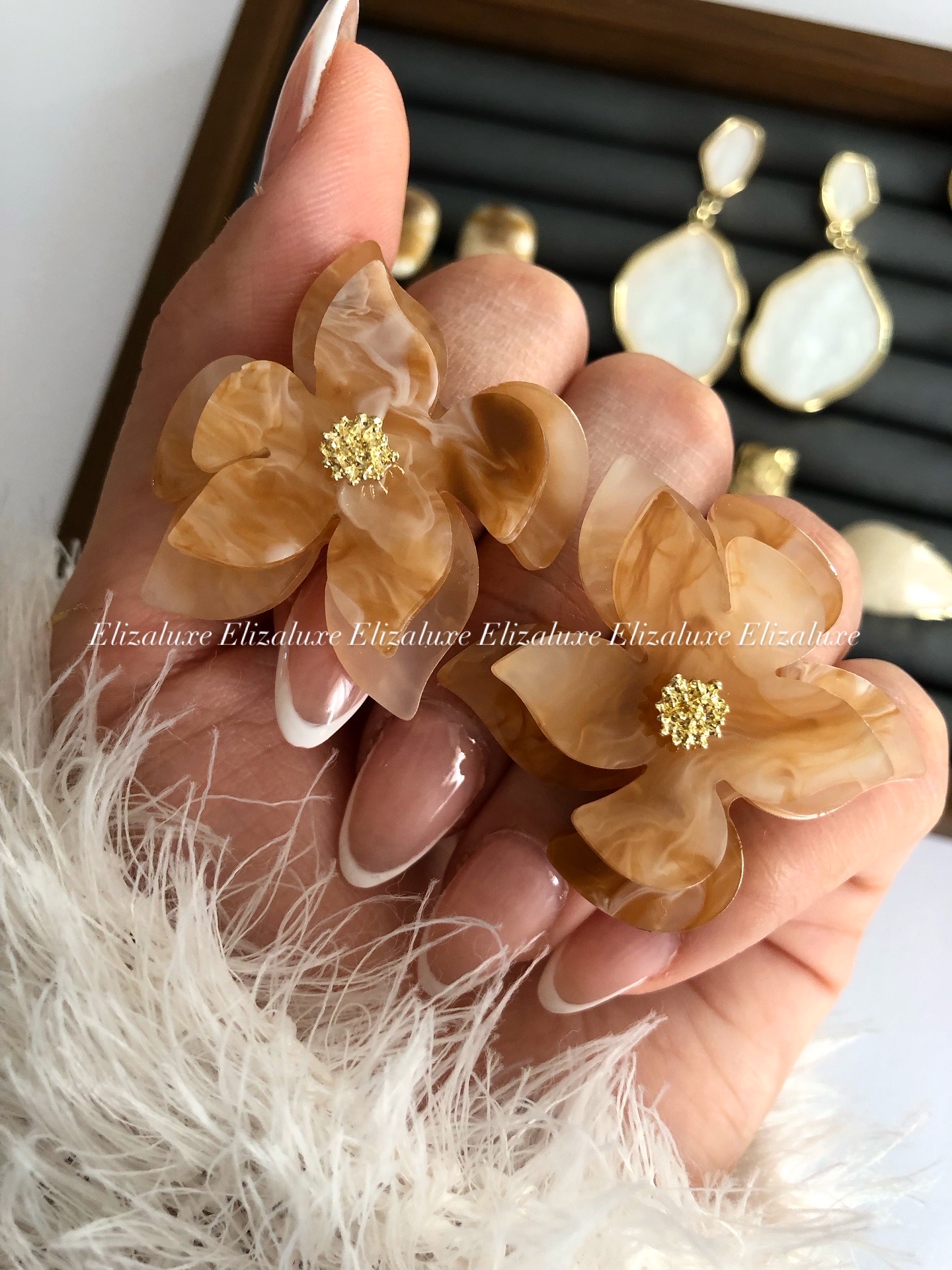 گوشواره گل طرح سنگ رنگ عسلی روشن با مناسبترین قیمت گوشواره میخ ضدحساسیت بدون اذیت کردن گوش کاملا سبک