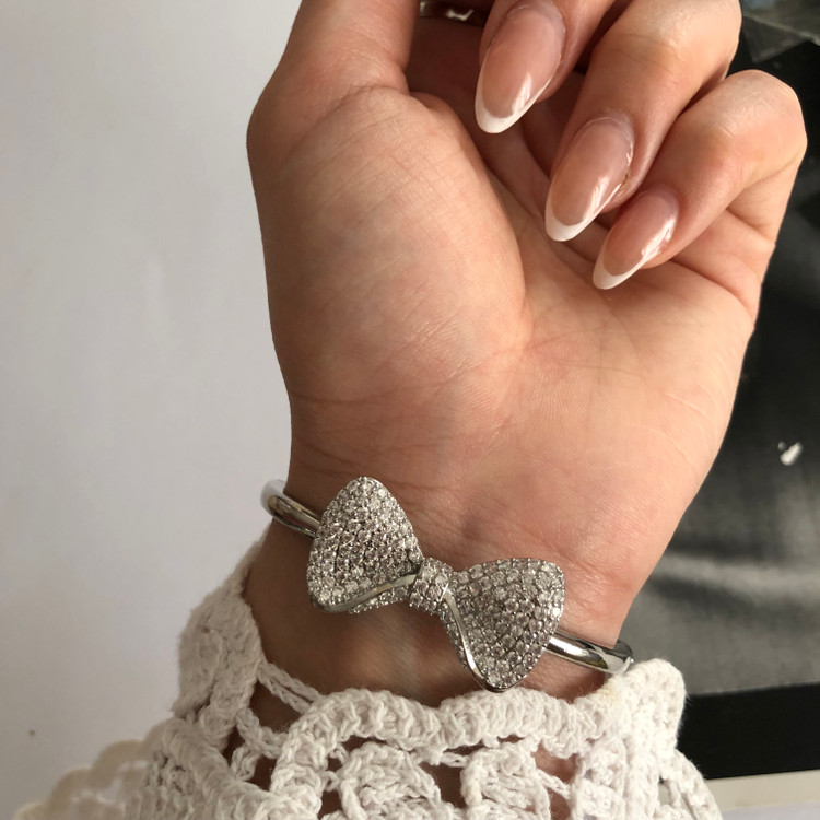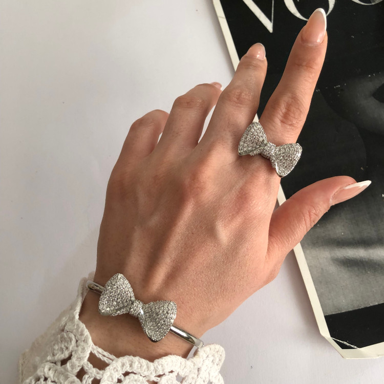 ست انگشتر و دستبند زنانه جواهری طرح پاپیون رنگ نقره ای