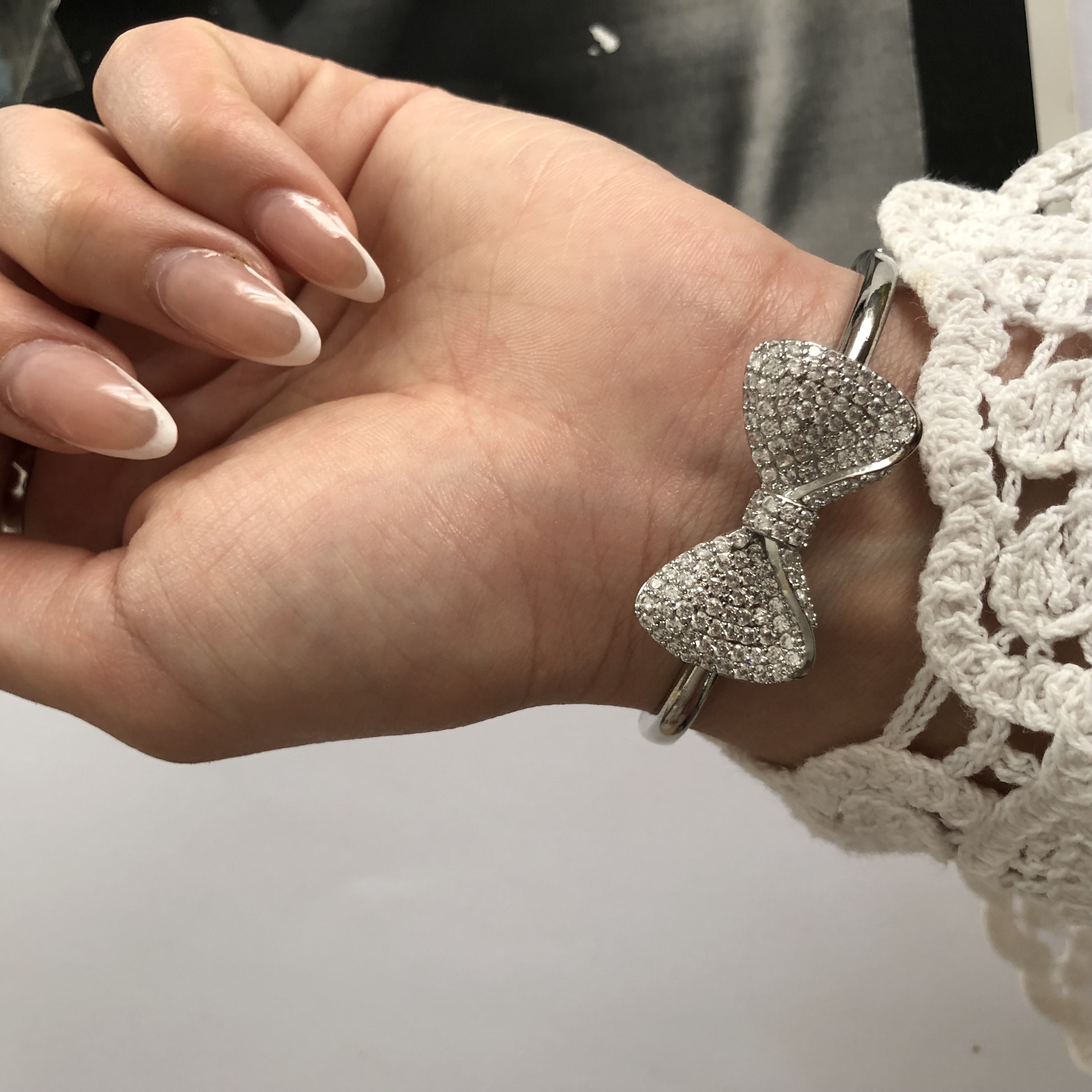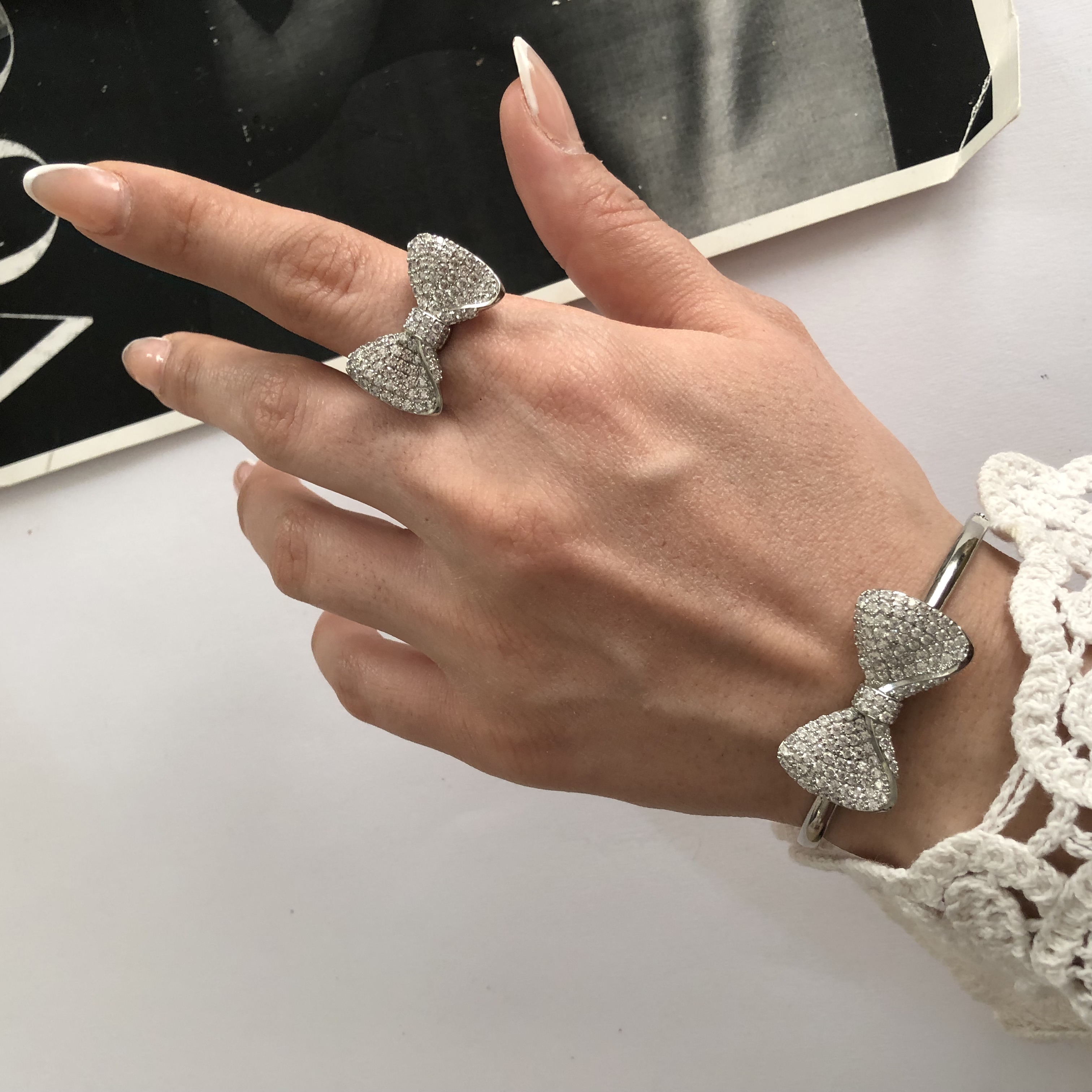 ست انگشتر و دستبند زنانه جواهری طرح پاپیون رنگ نقره ای