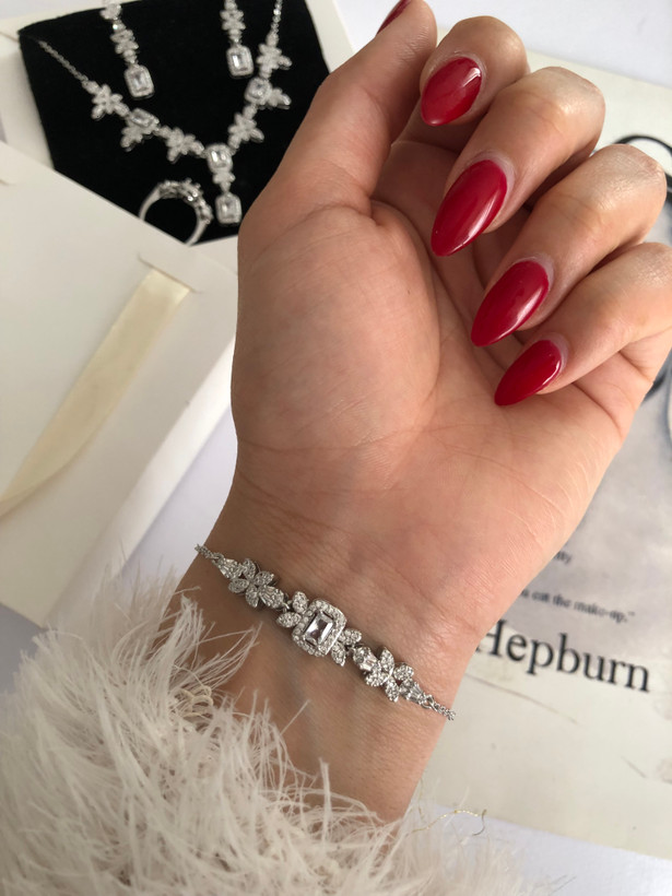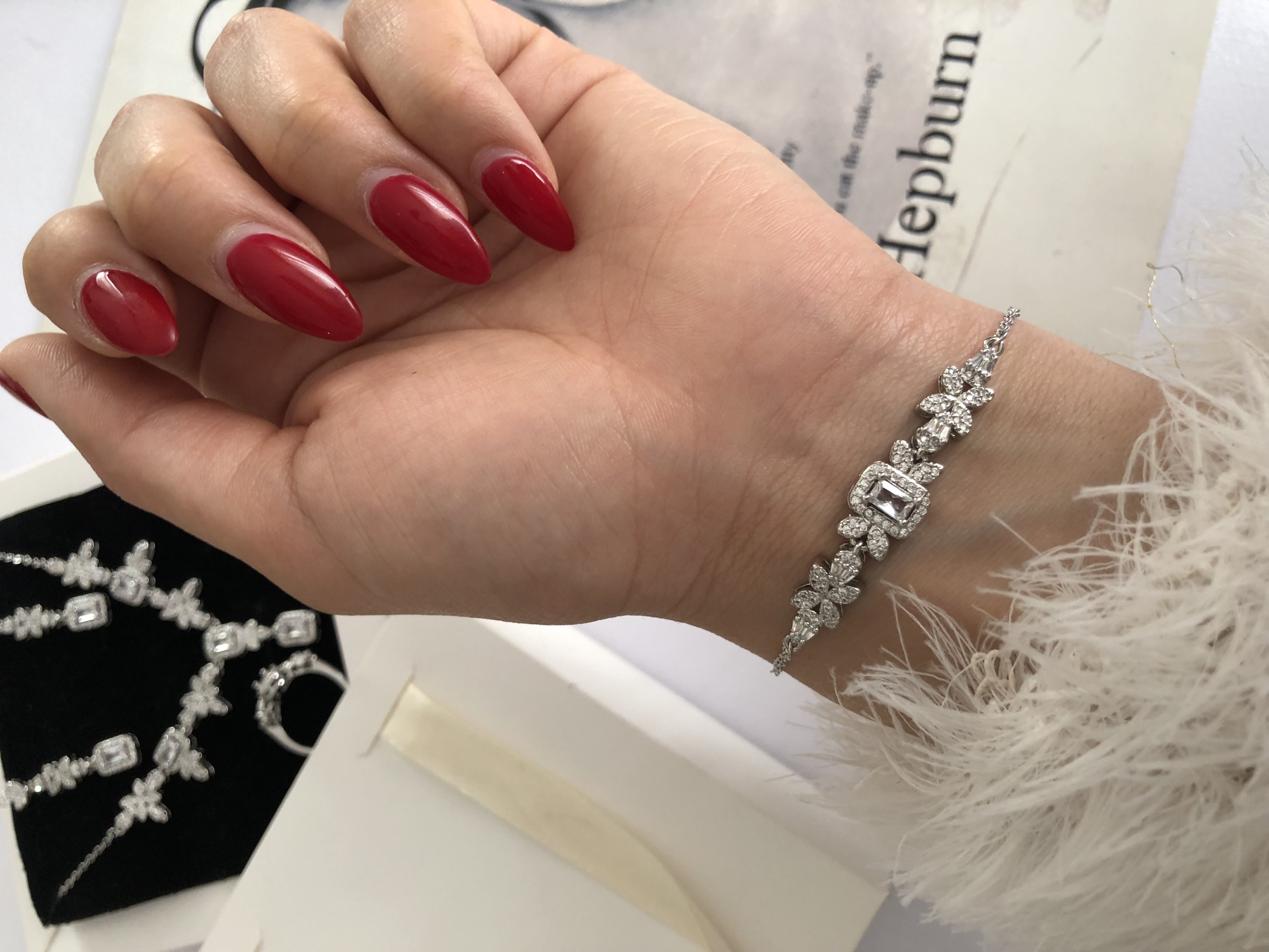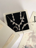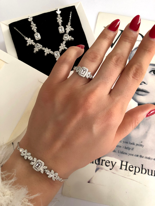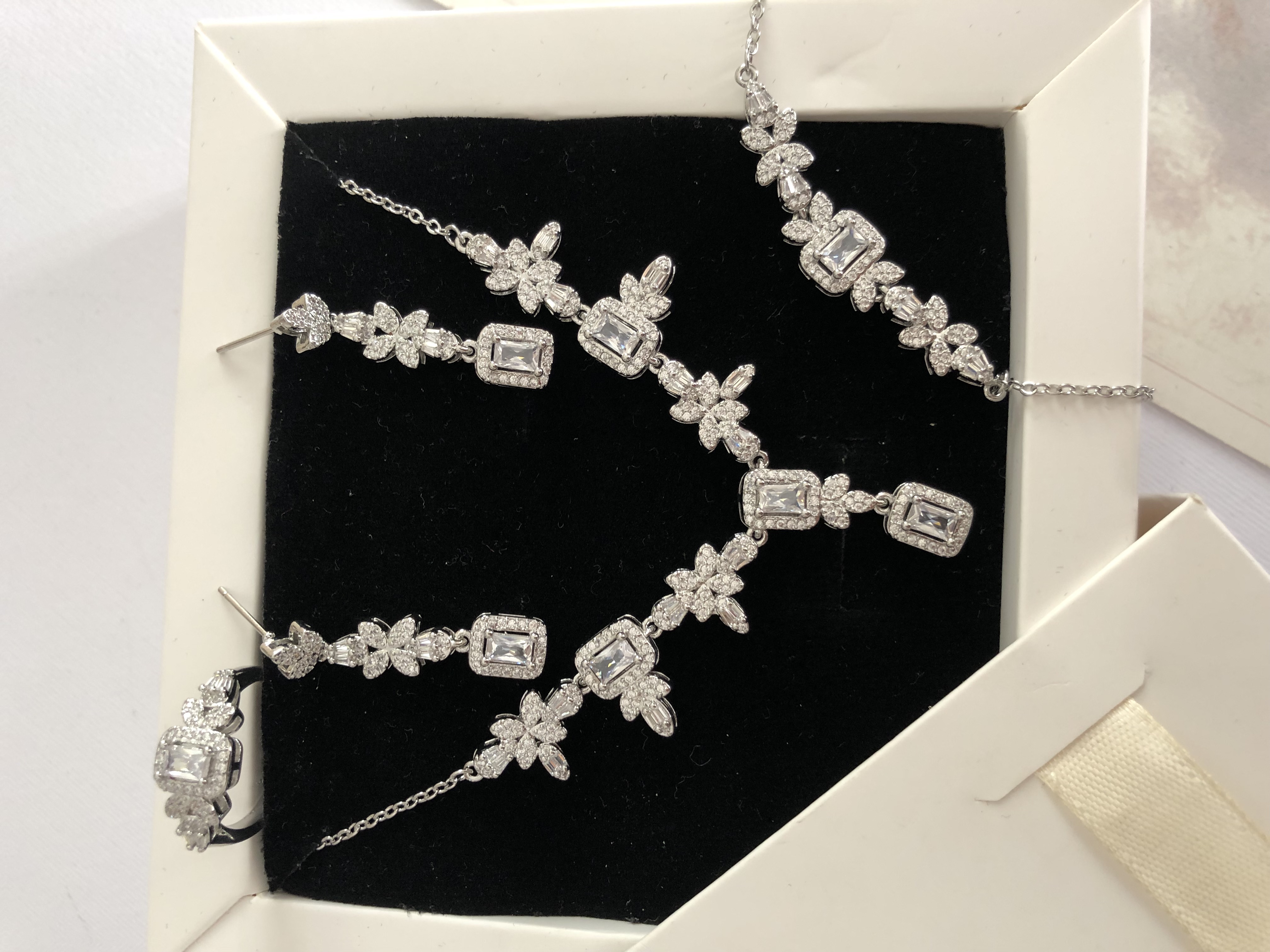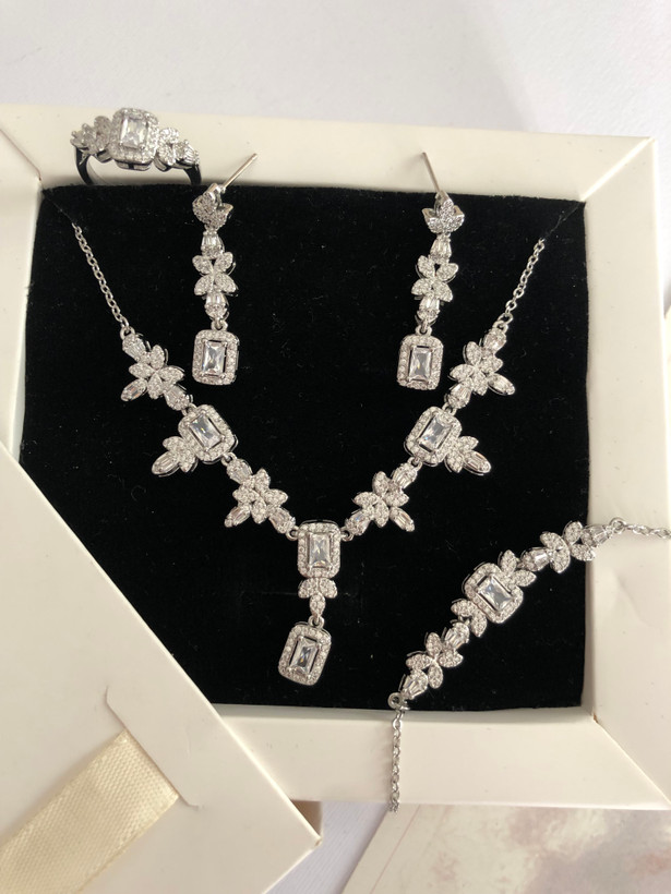 سرویس جواهری طرح طلا رنگ نقره ای دارای نگینای درخشان شامل گردنبند ، دستبند ، گوشواره میخی ، انگشتر