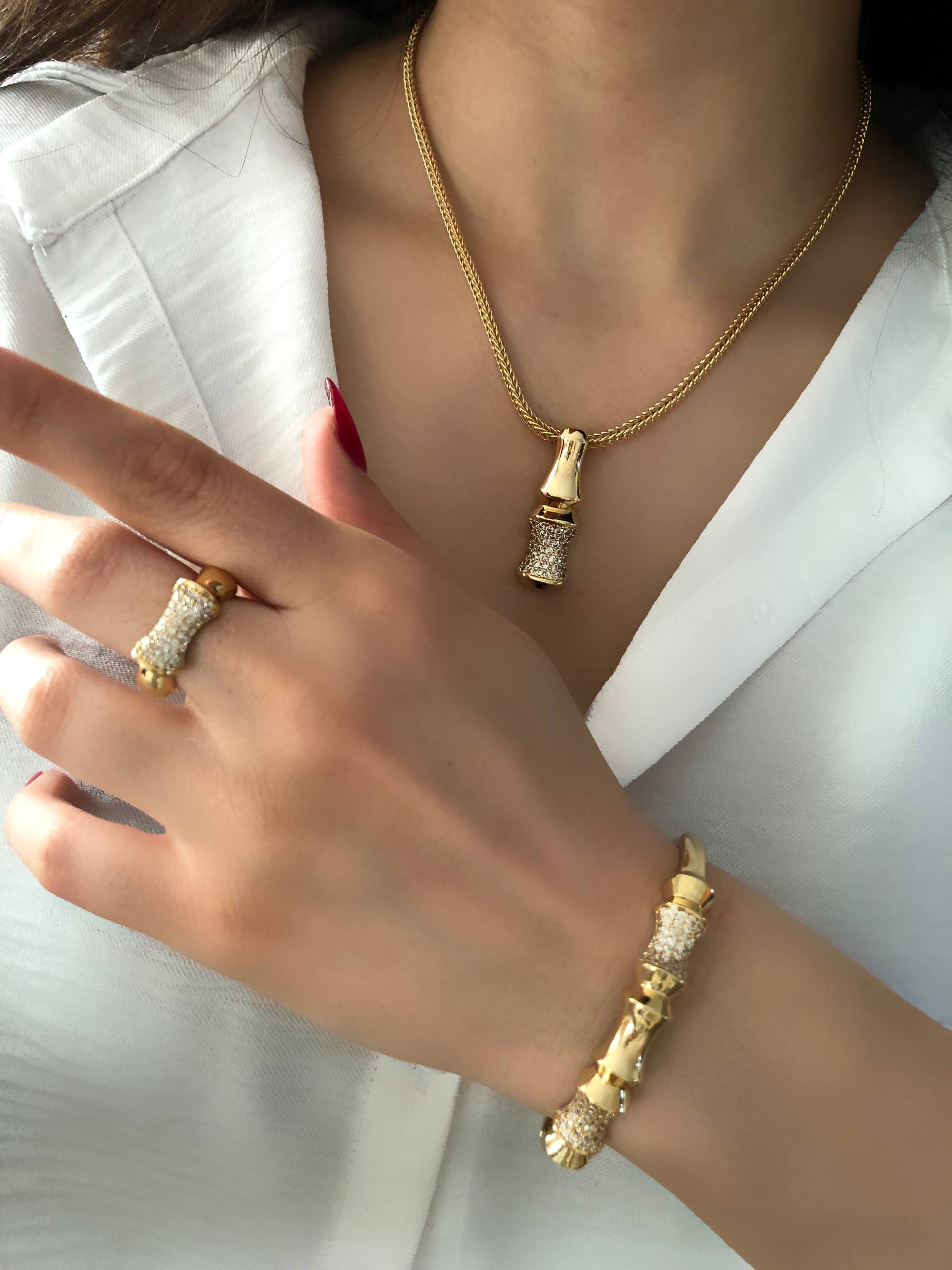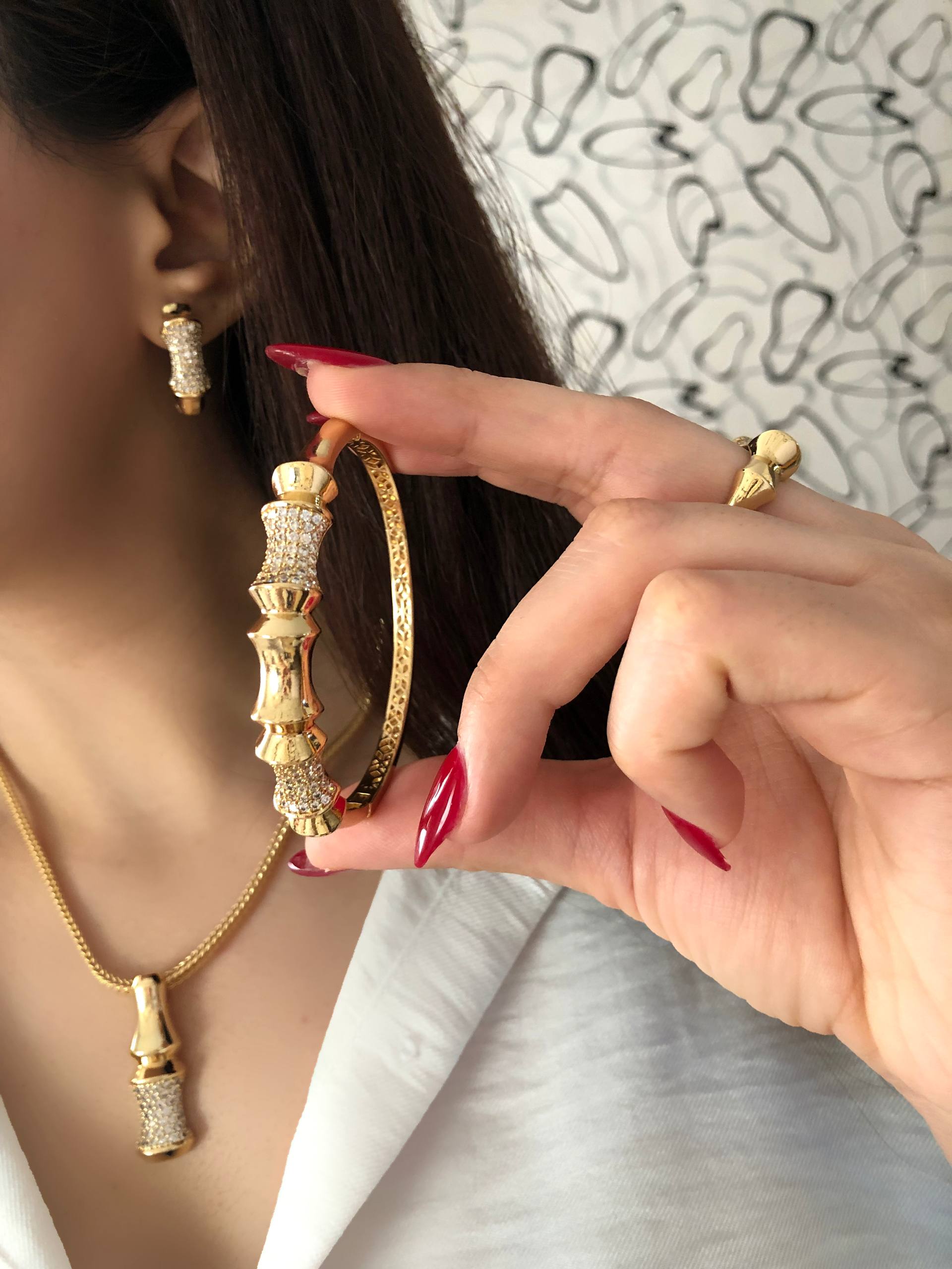 سرویس زنانه طرح طلای بامبو کاملا مشابه طلا شرکتی و برند nyh بهترین کیفیت ابکاری گوشواره کلیپسی ، بنگل مناسب تا مچ ۱۸ سانت ،انگشتر فری سایز ، طول گردنبند ۲۶ سانت، مناسب مهمانی و مجالس