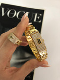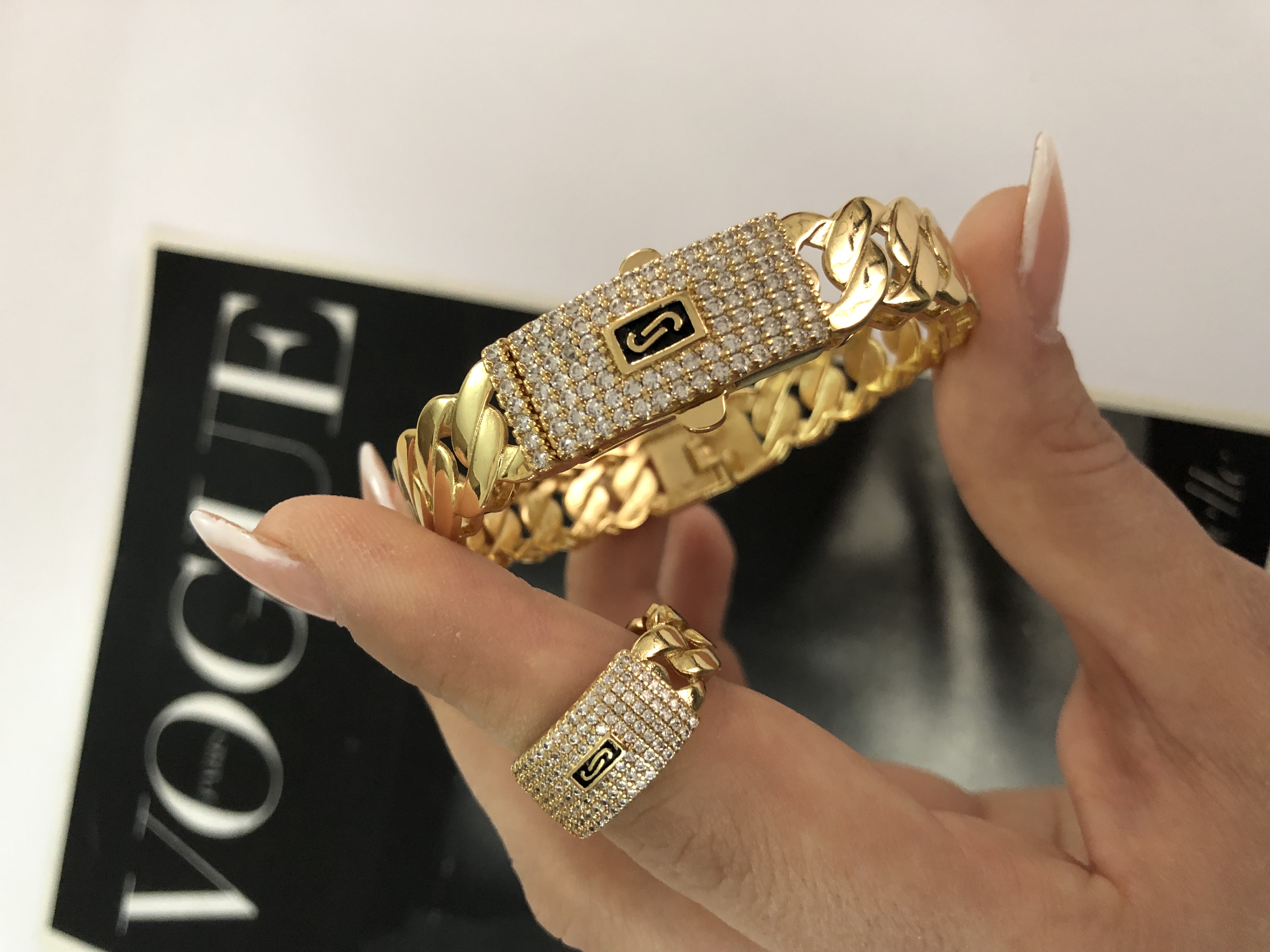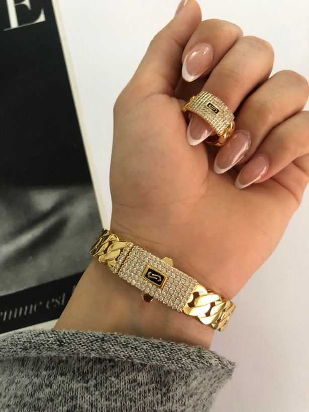 ست بنگل و انگشتر جواهری برند مسیکا طرح و مشابه نمونه اصلی طلا کیفیت اصلی با ابکاری فوق العاده بالا مناسب مهمانی و مجالس دستبند مناسب مچ تا ۱۷ سانت انگشتر فری سایز