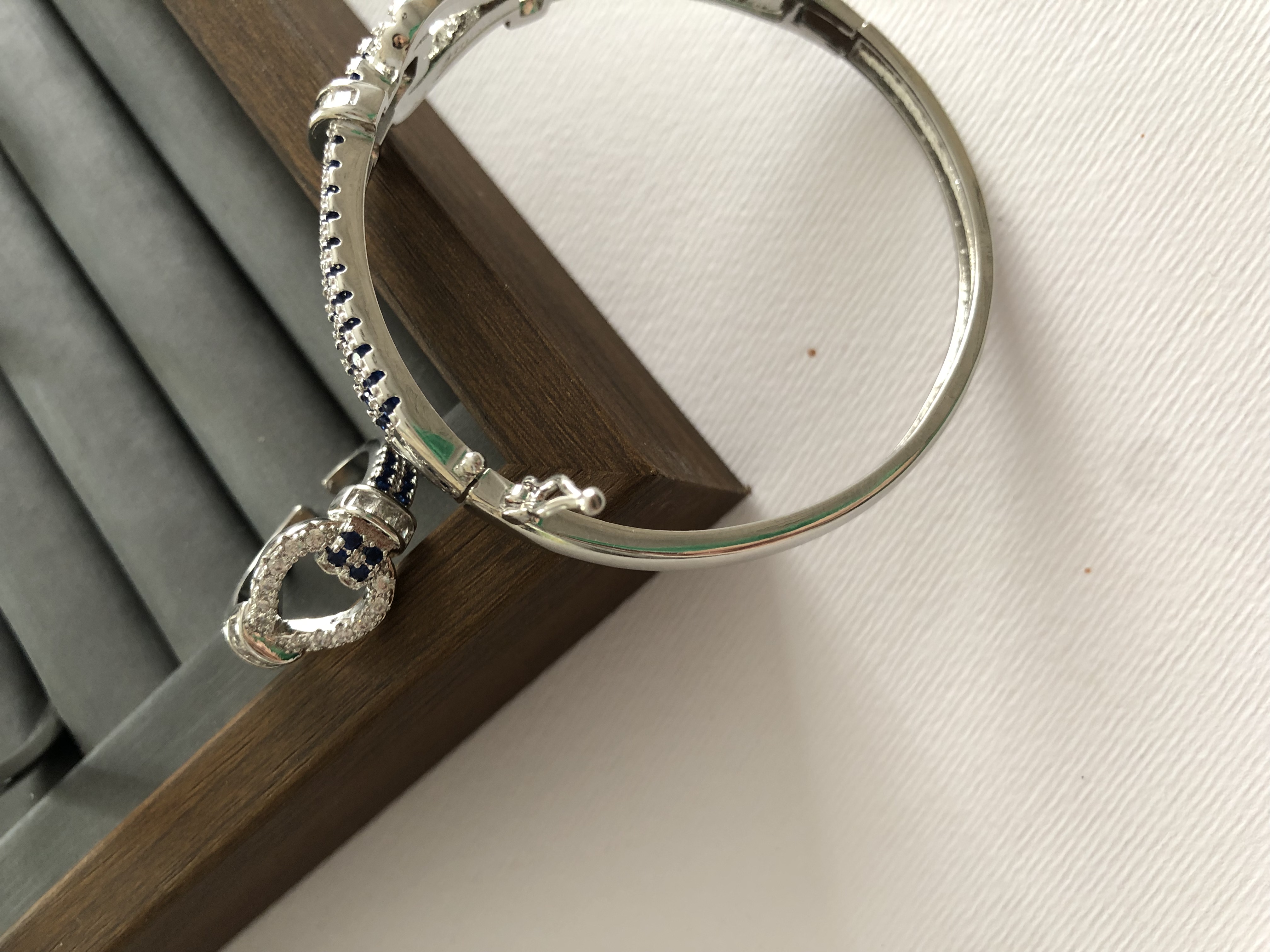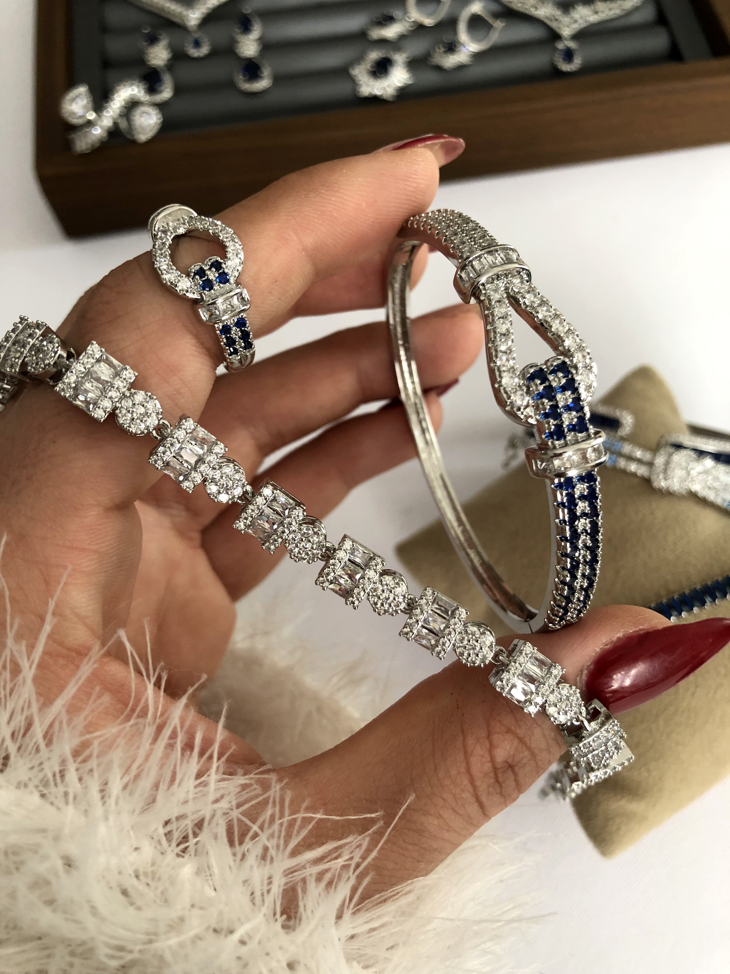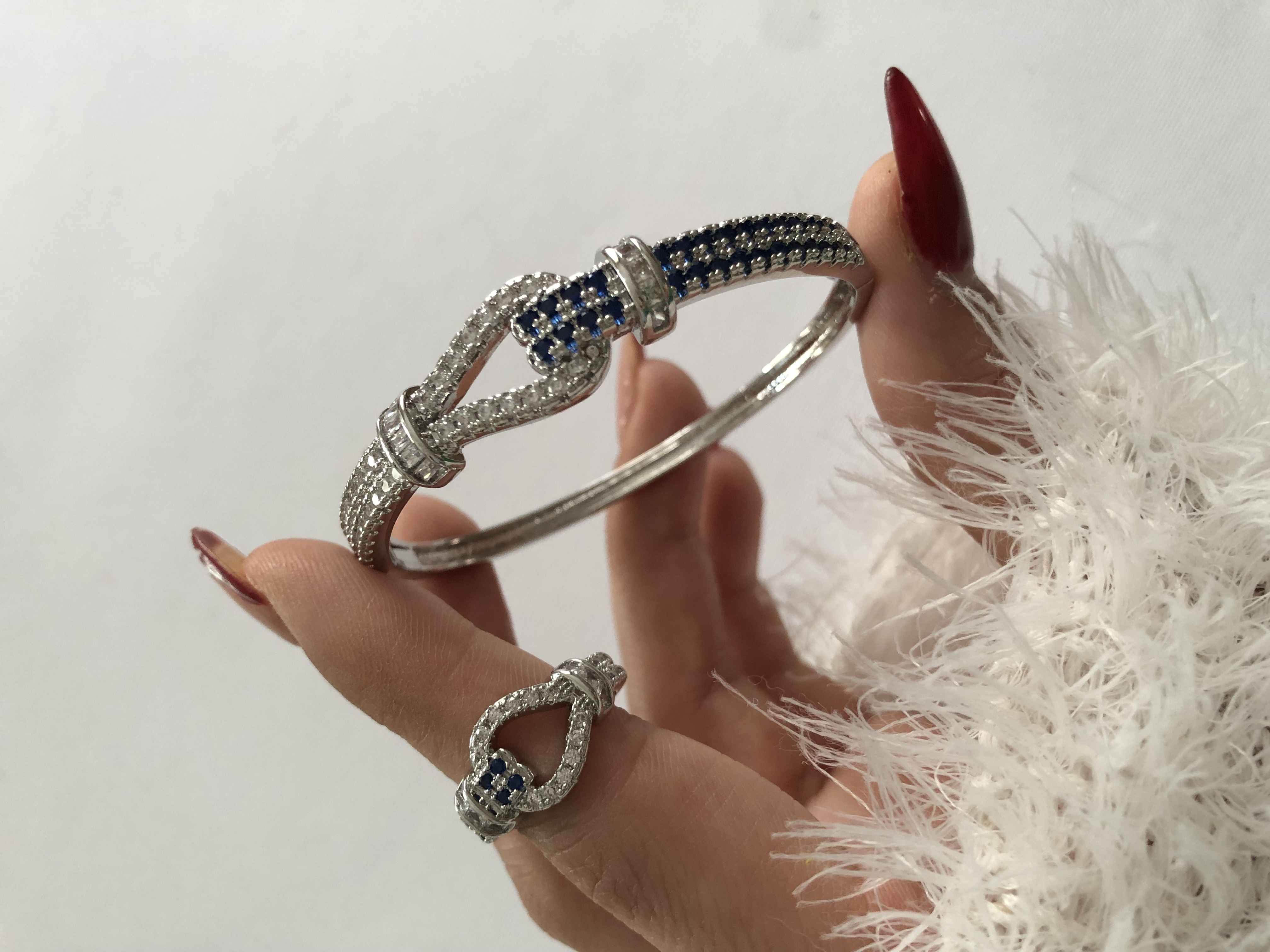 ست بنگل و انگشتر جواهری با نگین سرمه ای مخراجکاری شده طرح و مشابه نمونه اصلی طلا کیفیت اصلی با ابکاری فوق العاده بالا با قفل جواهری مناسب مهمانی و مجالس دستبند مناسب مچ تا ۱۷ سانت انگشتر فری سایز