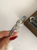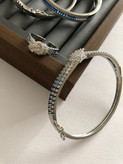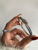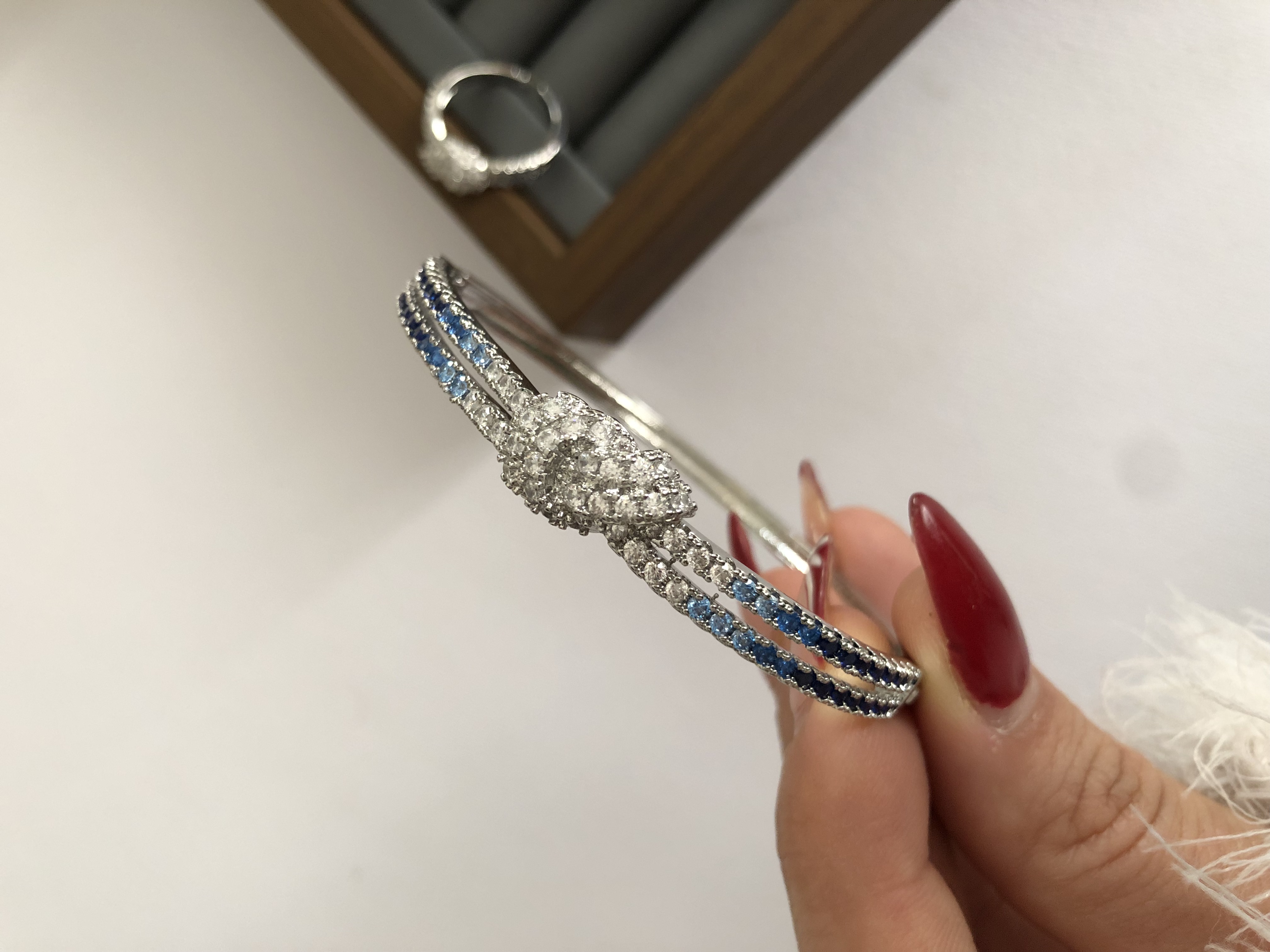 ست بنگل و انگشتر جواهری گره نگین سرمه ای طرح و مشابه طلا دارای قفل جواهری ، ست کیفیت اصلی ، نگین مخراجکاری شده ابکاری فوق العاده بالا مناسب مهمانی و مجالس انگشتر فری سایز بنگل فری سایز نهایت تا مچ ۱۷/۵ سانت